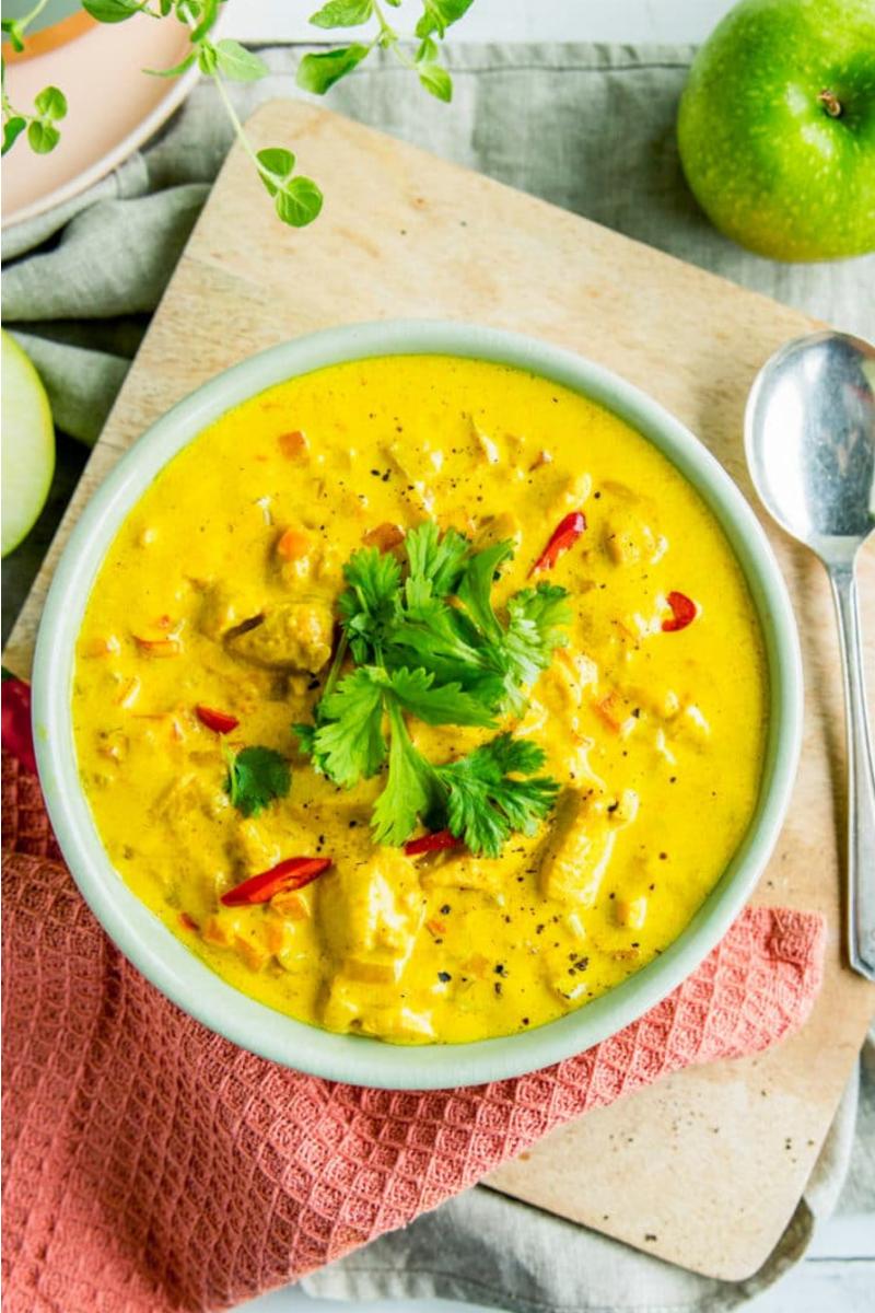En indiskinspirert, spicy kyllingsuppe med grønnsaker, hjemmelaget curry og kokosmelk.